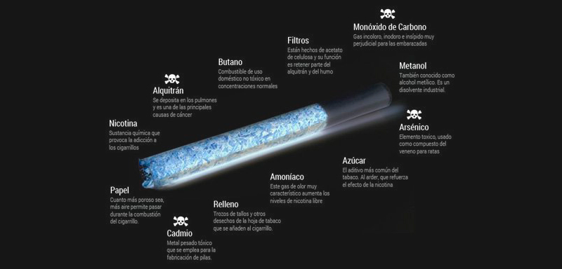 Cuando un cigarrillo se quema, se liberan más de 7.000 sustancias químicas, de las cuales al menos 70 son cancerígenas conocidas. Aquí te presentamos algunas de las más peligrosas: